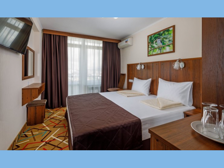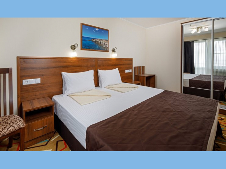 Современное 17-этажное здание пансионатаимеет номерной фонд на 512 мест, из окон каждого номера открывается живописный вид на бухту и горы. 2-местные номера стандарт с балконом.
